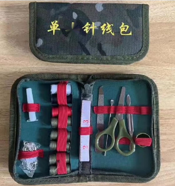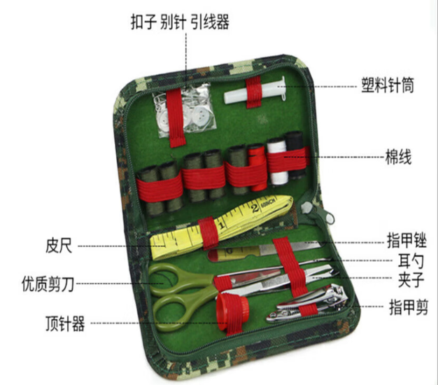 針線包內(nèi)含有:針筒、紐扣、剪刀、皮尺、棉線、指甲剪等多種針線品種;顏色:21式叢林星空迷彩。